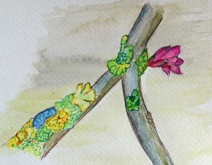 I created a painting of the flower and lichen on a twig of the Cercis, using watercolour pencils, fibre tip pens and watercolour colour washes..
