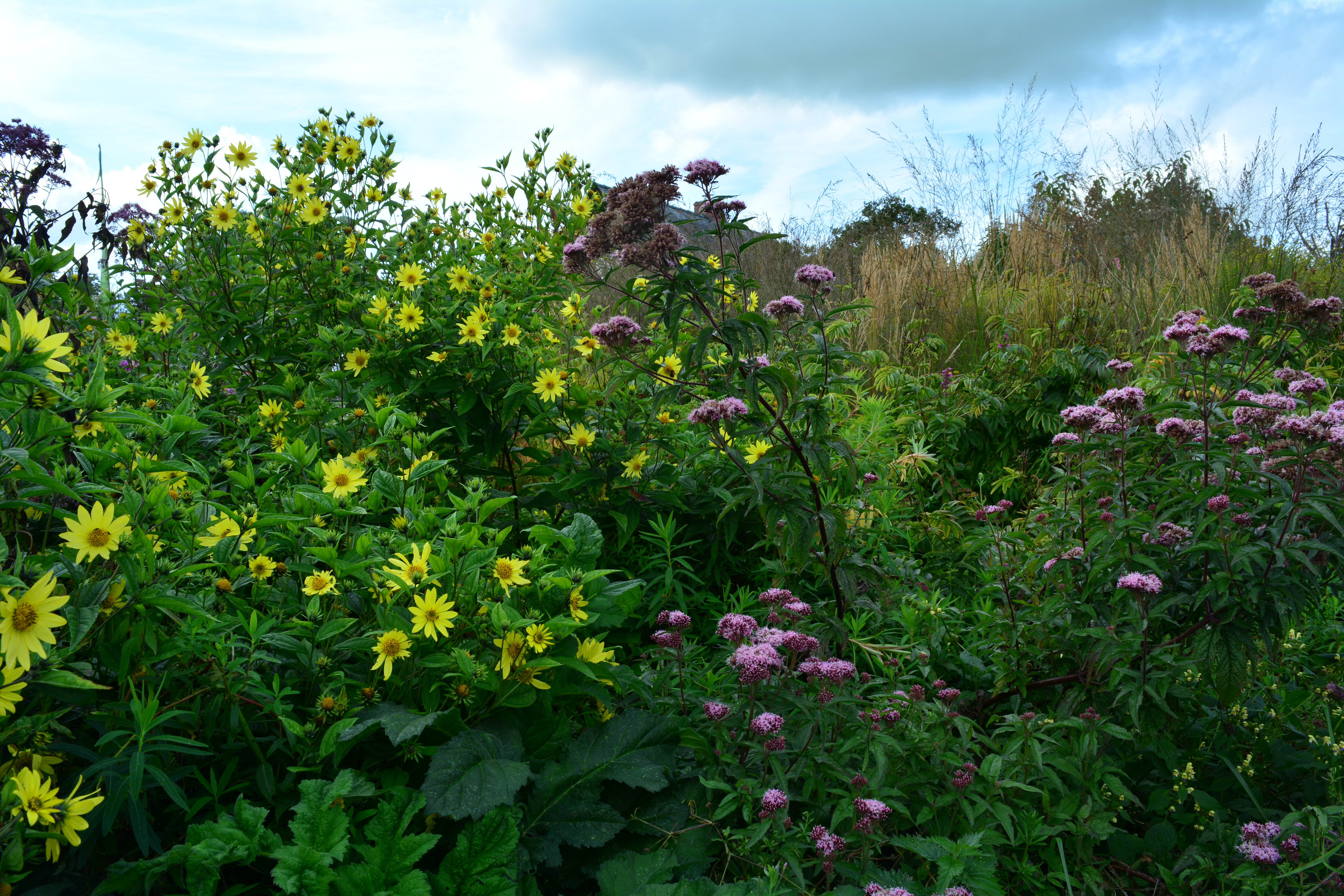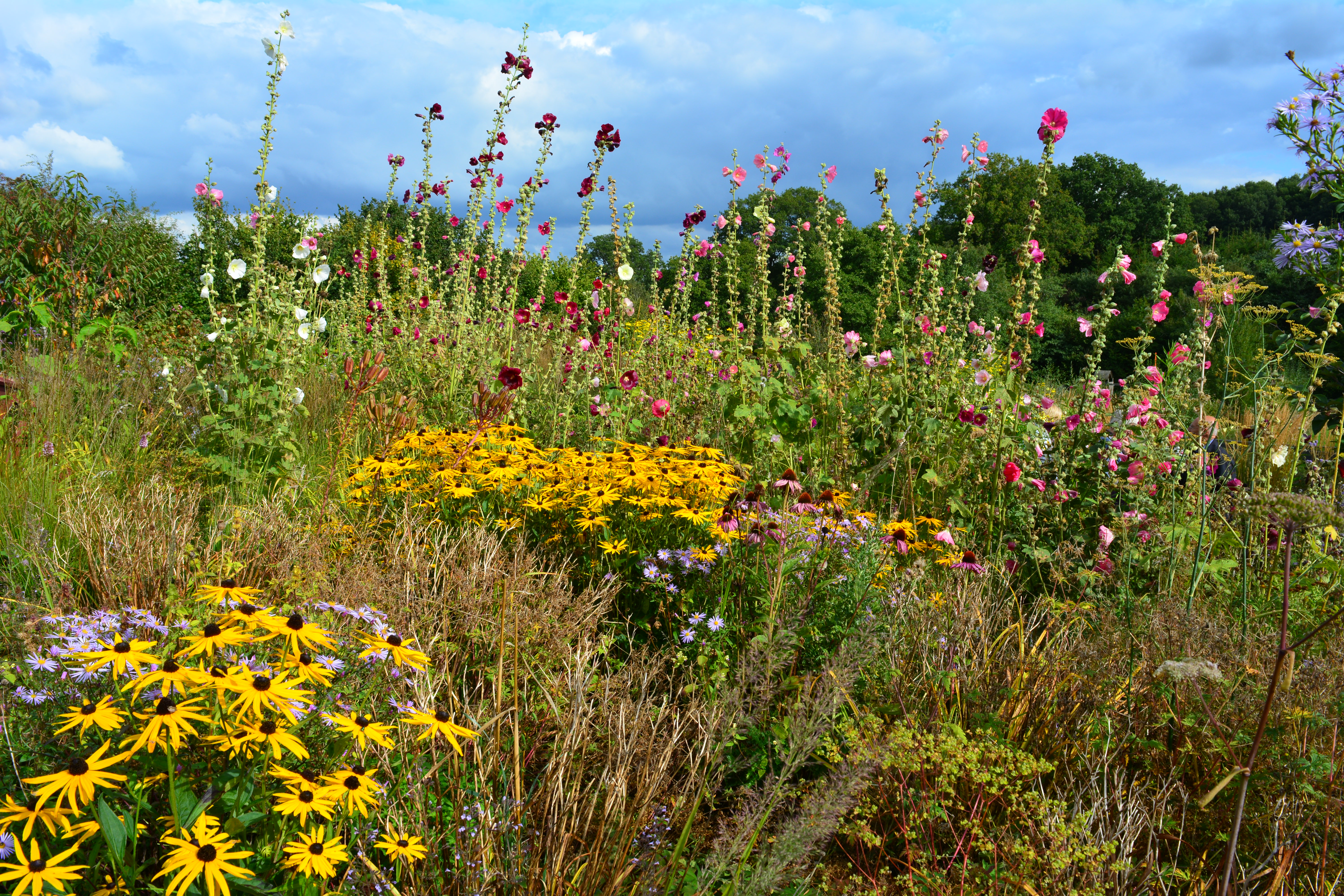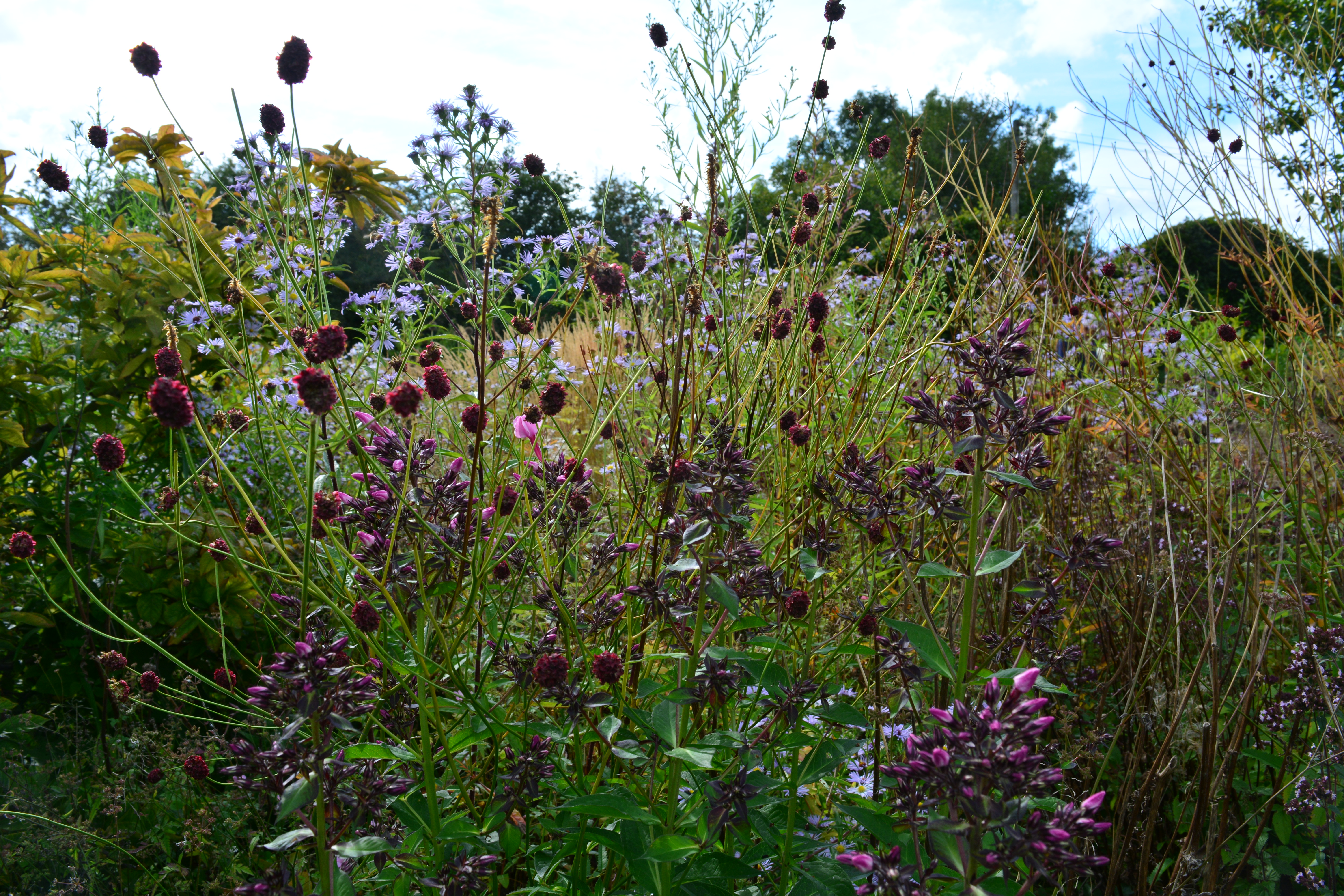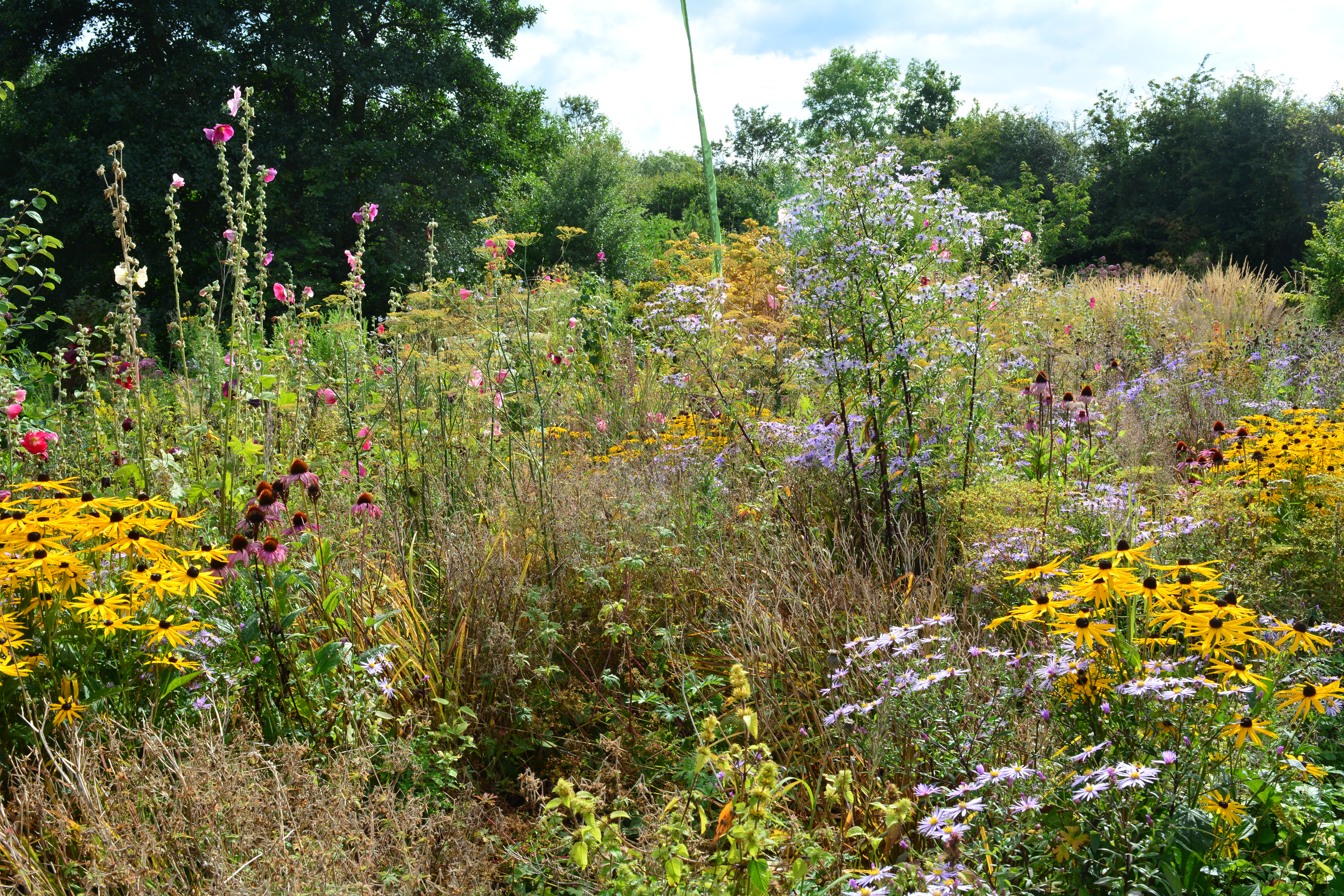 To one side tall trees grew skyward from a native hedge and gravel paths invited us to discover the borders of meadowy prairie planting.