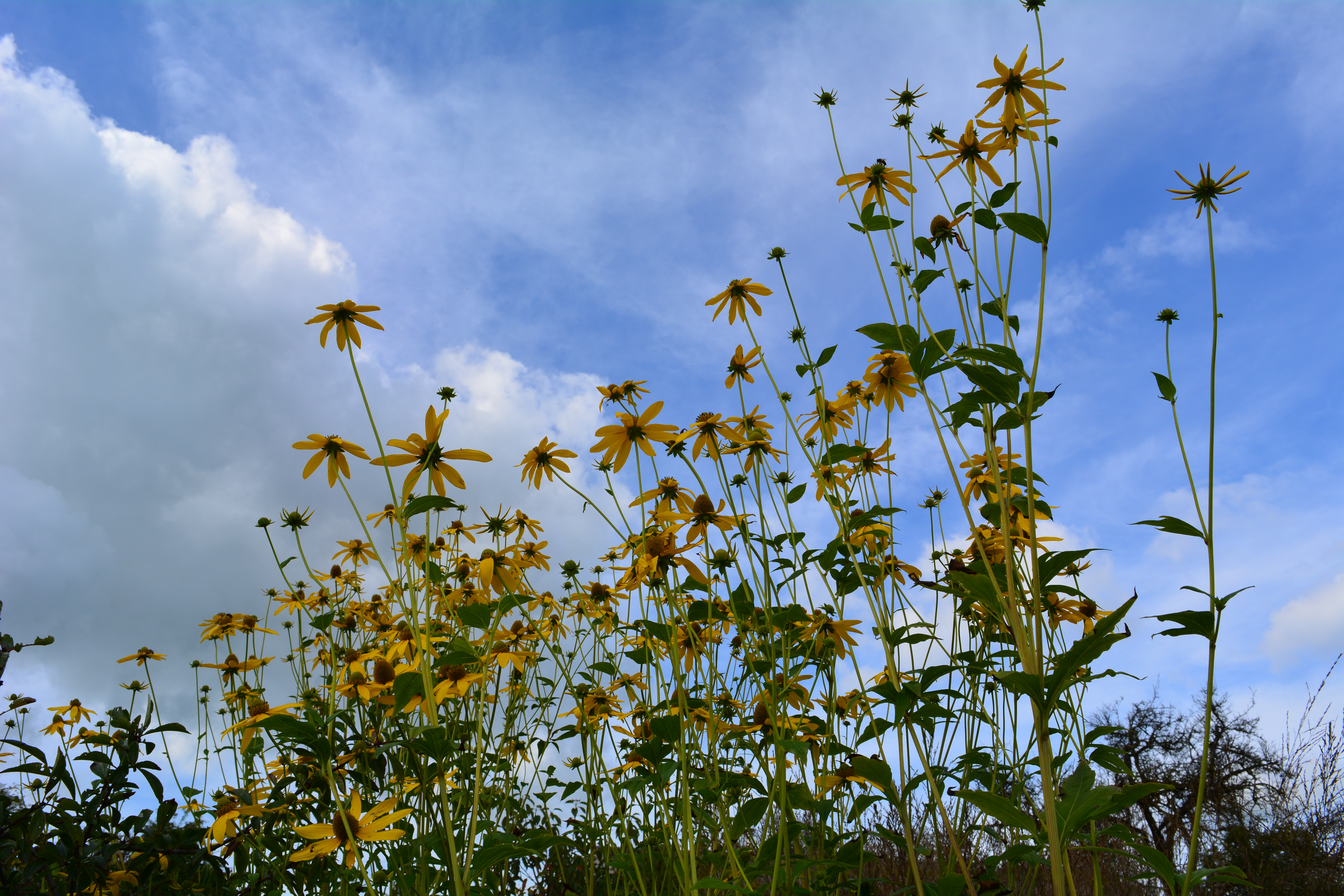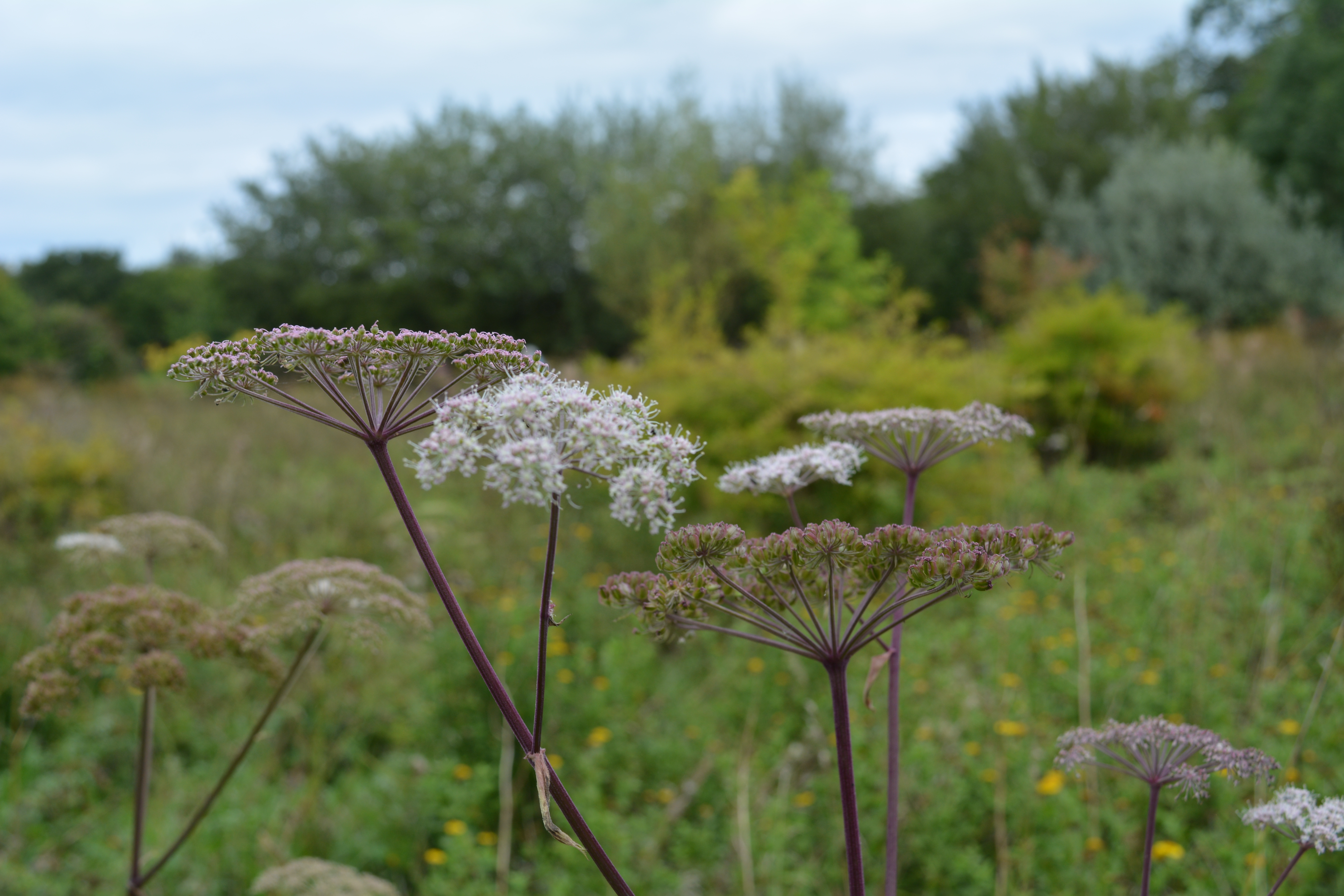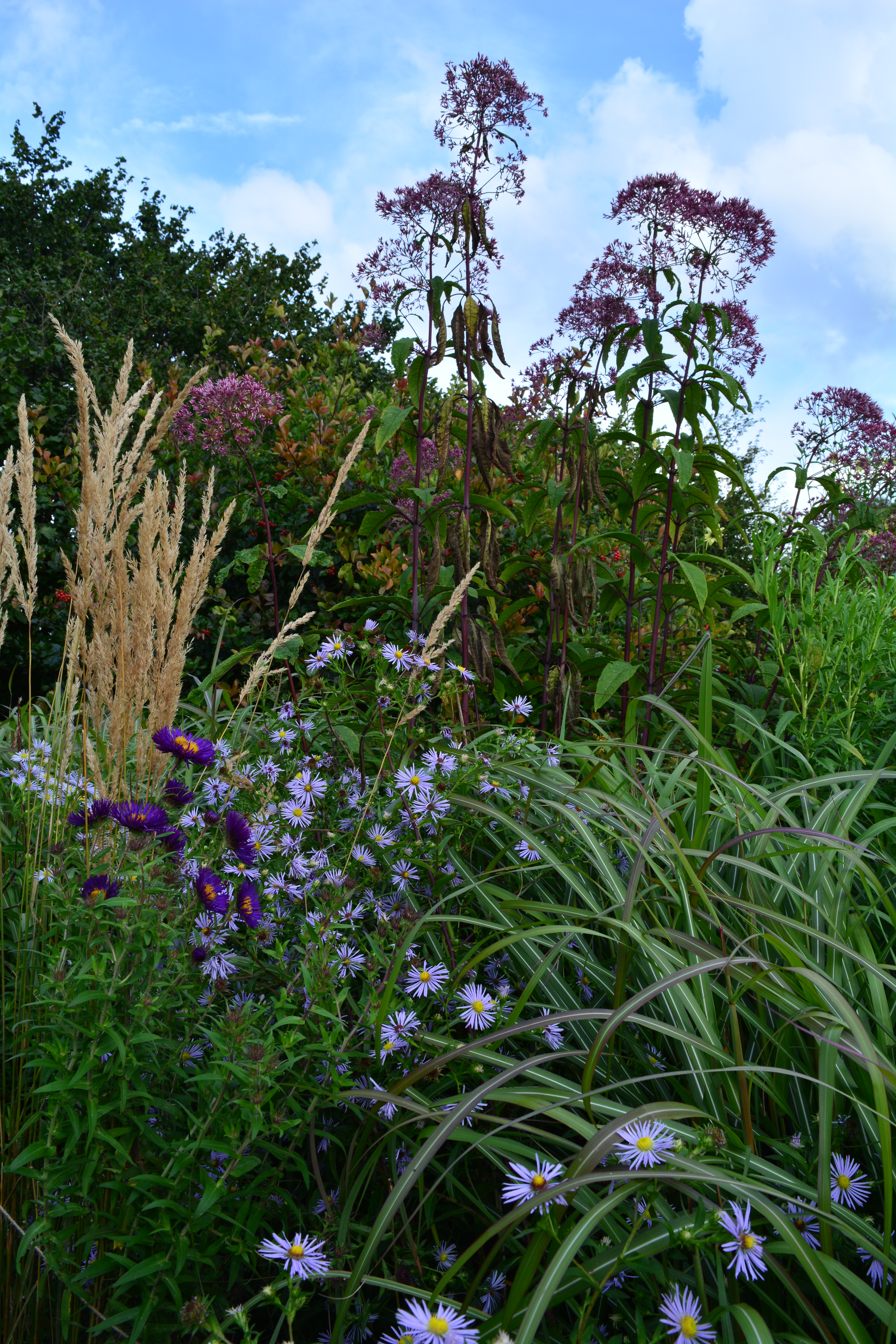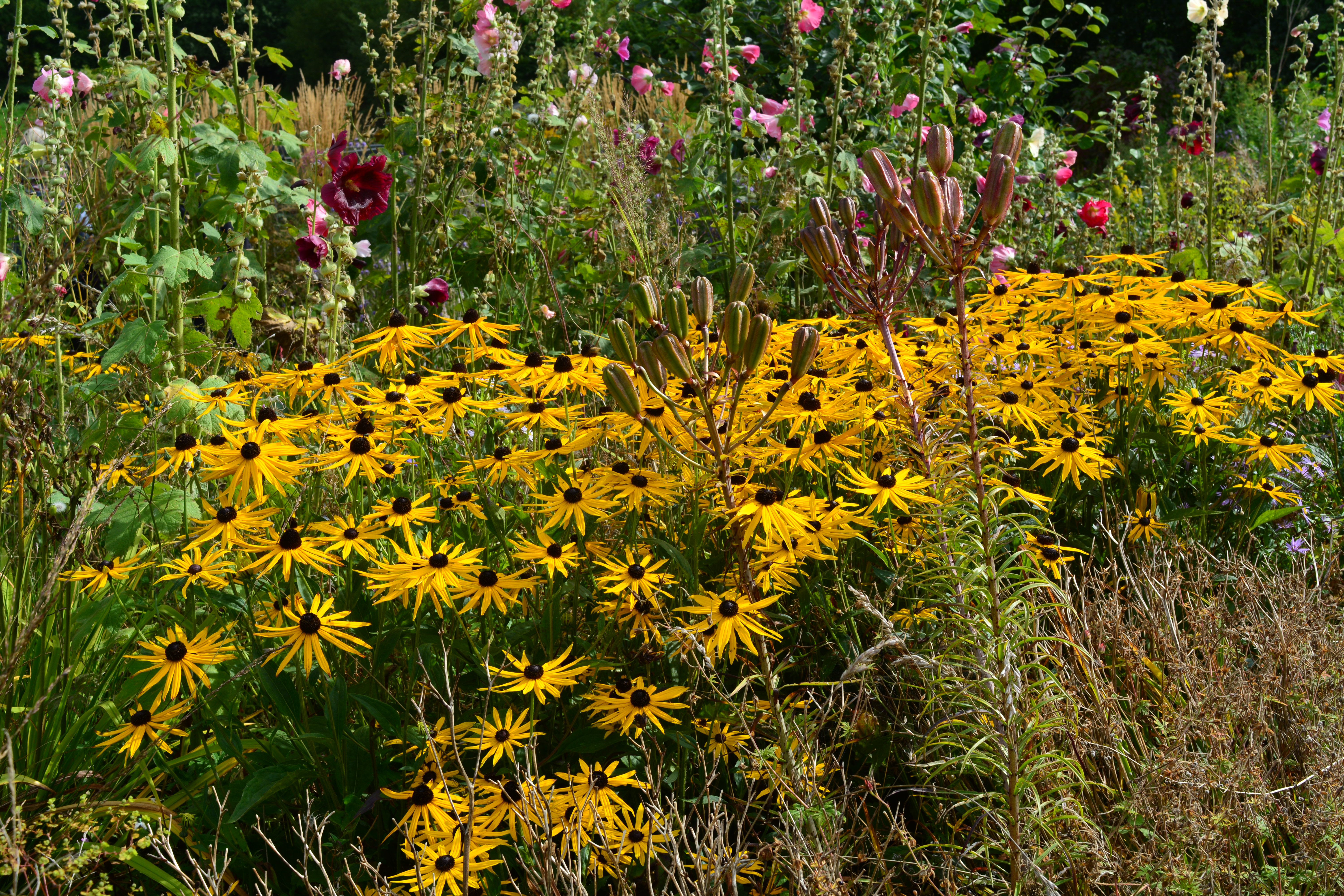 To one side tall trees grew skyward from a native hedge and gravel paths invited us to discover the borders of meadowy prairie planting.
