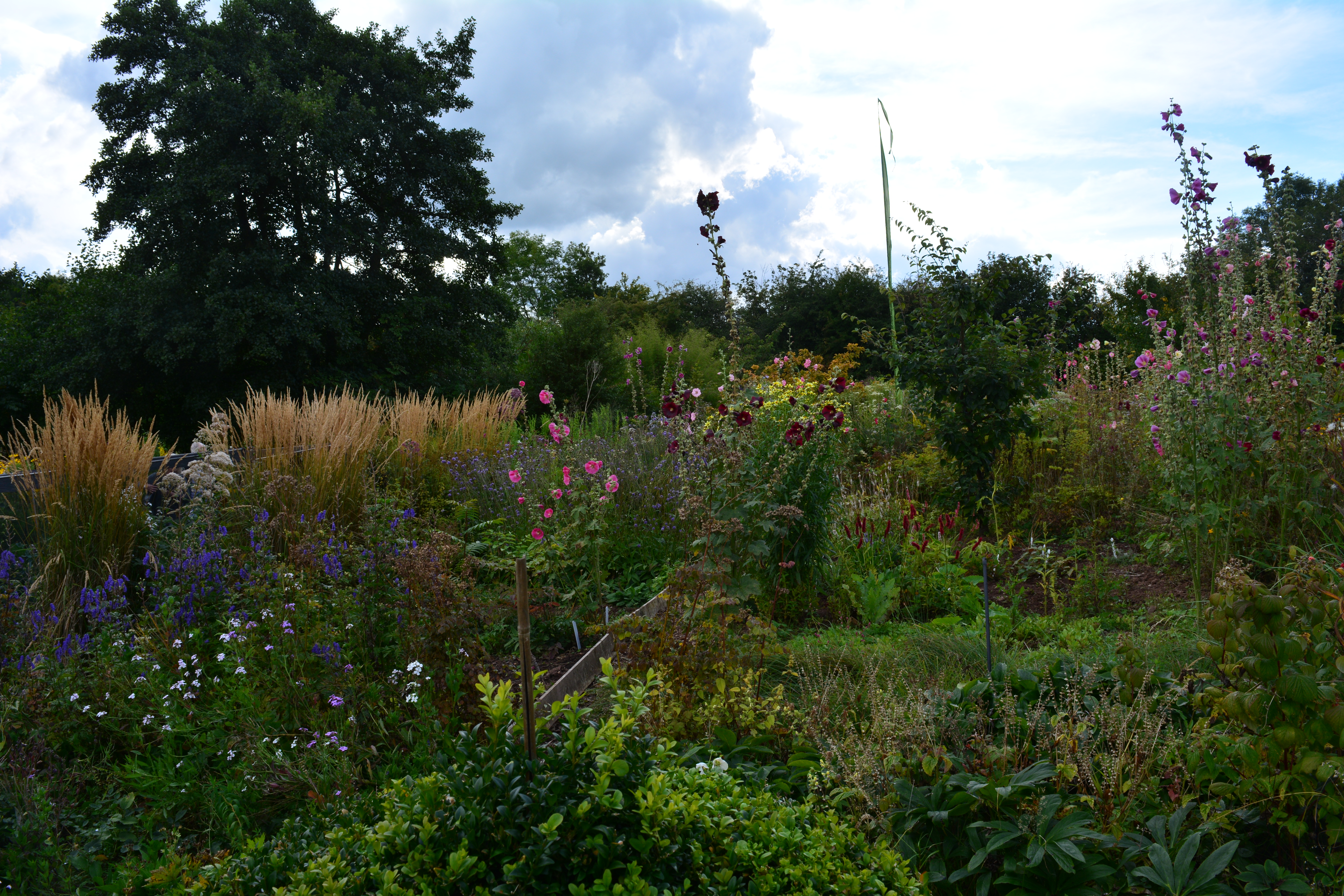 Exploring further steps took us around a series of raised beds holding herbs, cut flowers and nursery beds. Scent was evident here too, the warm relaxing scents of herbs. Soft coloured flowers burst from glaucous blues and grey of herb foliage. Temptation made us rub leaves between our fingers to savour the aromas and flavours.