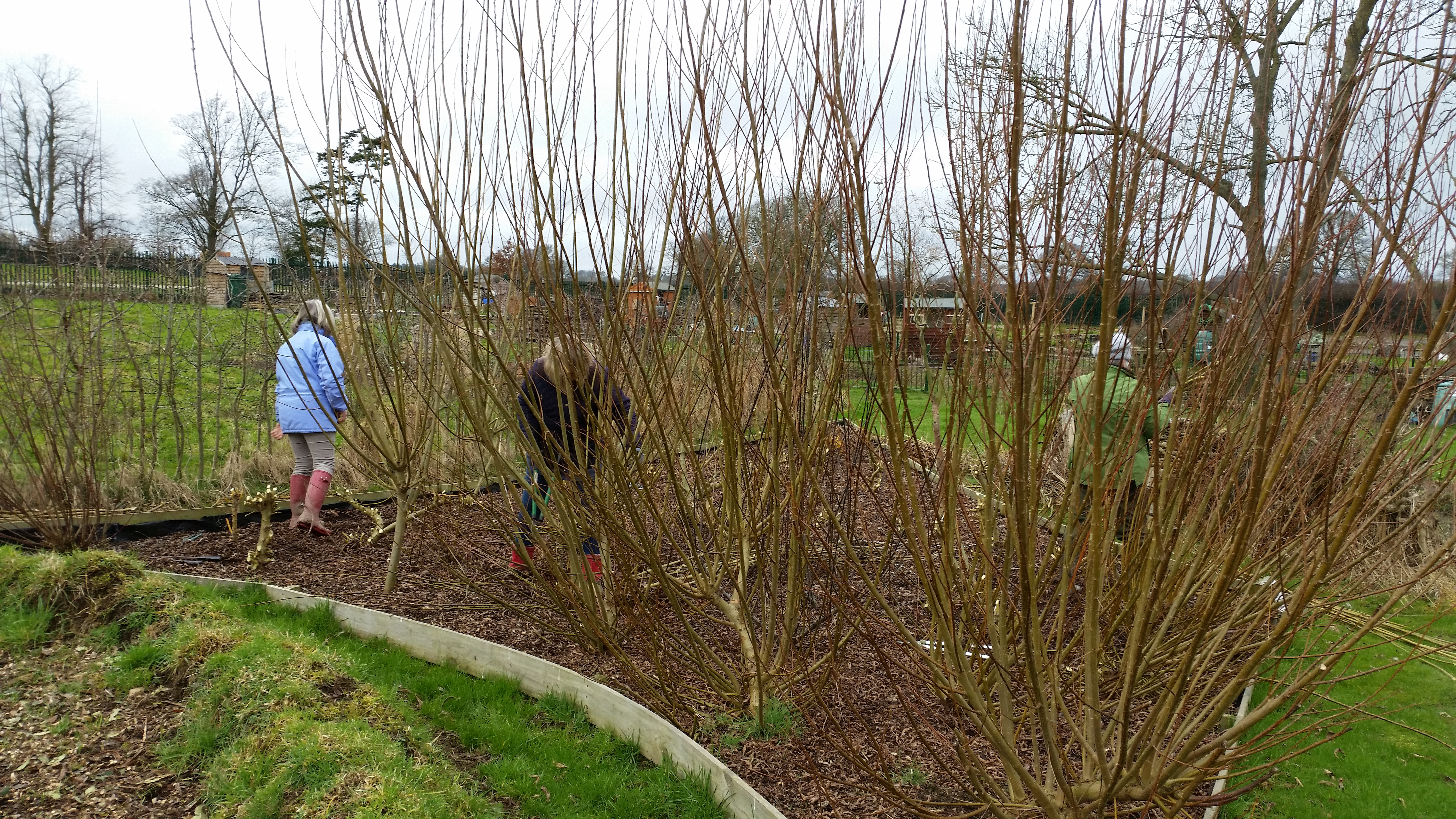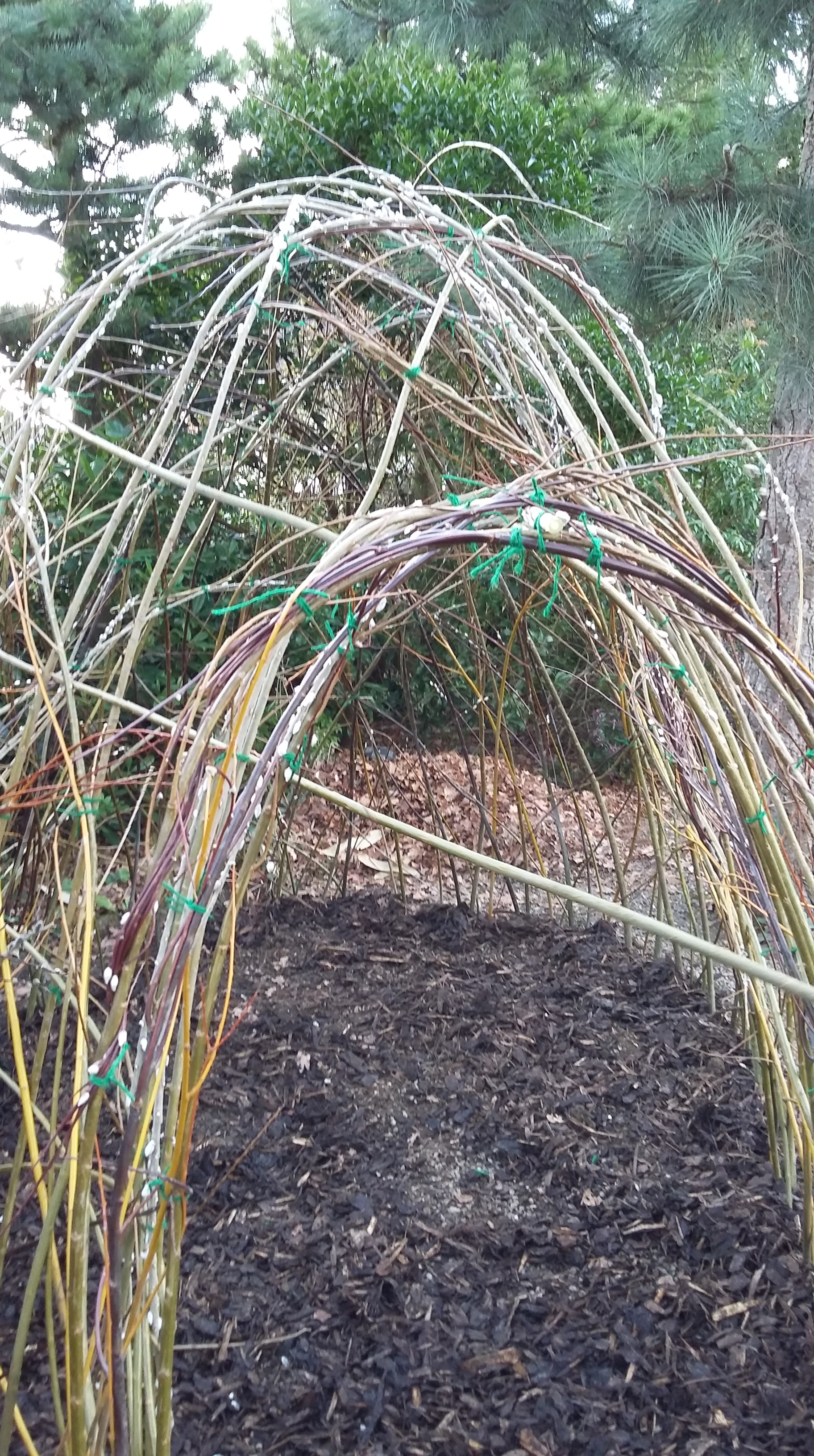 We used some of the prunings from the pollarded Violet Willow in our garden which I shared in my recent post about my garden journal in February, along with lots of different coloured prunings from our allotment community garden which was also featured in an earlier post concerning the magic of willows. We found a suitable spot in the bottom of the garden partly shaded under mature trees and with a good amount of moisture in the soil under a layer of gravel. We collected our tools together, marked out the shape and loosened the top layer of soil.