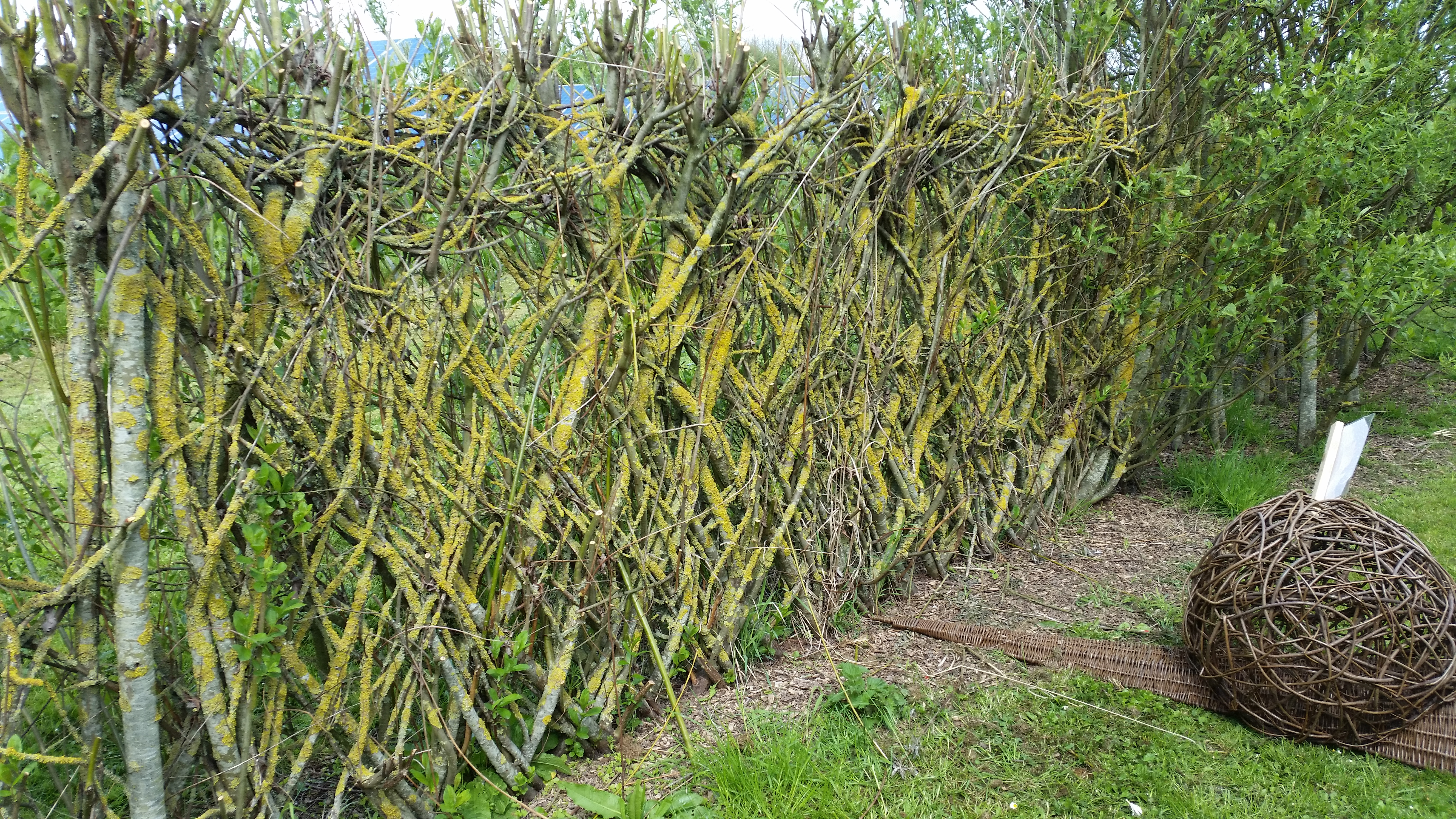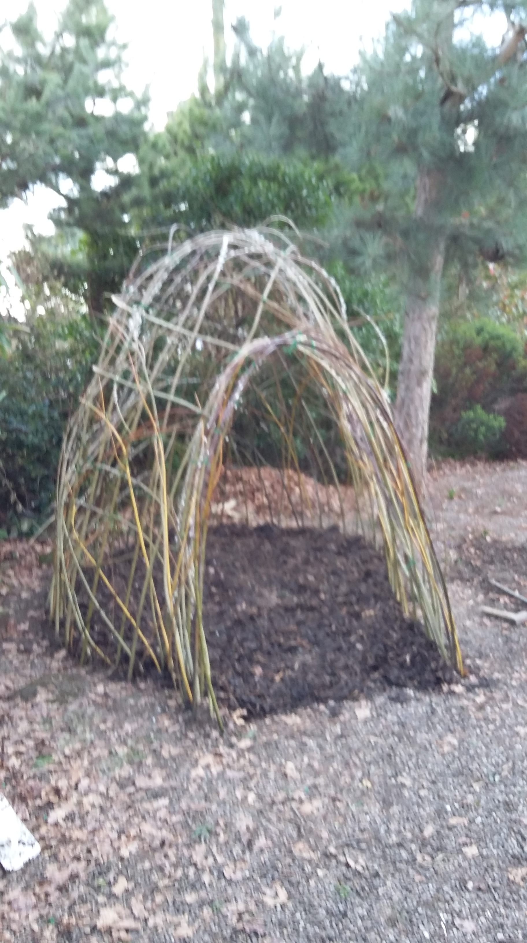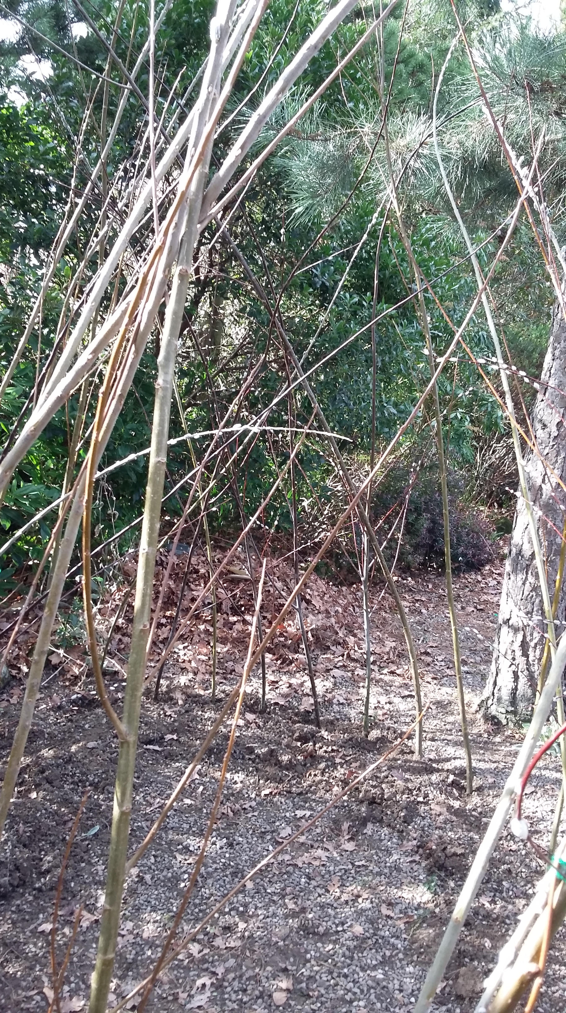 We made a low entry tunnel and then moved on to the main body. The area around the cuttings and the ground inside was mulched with bark chip partly to keep the prunings moist to help rapid rooting but also to make a comfortable play surface.