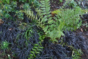 Metal panels with cut-out shapes of fern leaves reflect the planting beneath them in the border. John features many different versions of the low growing evergreen shrub, Leucothe. This one was a real beauty!
