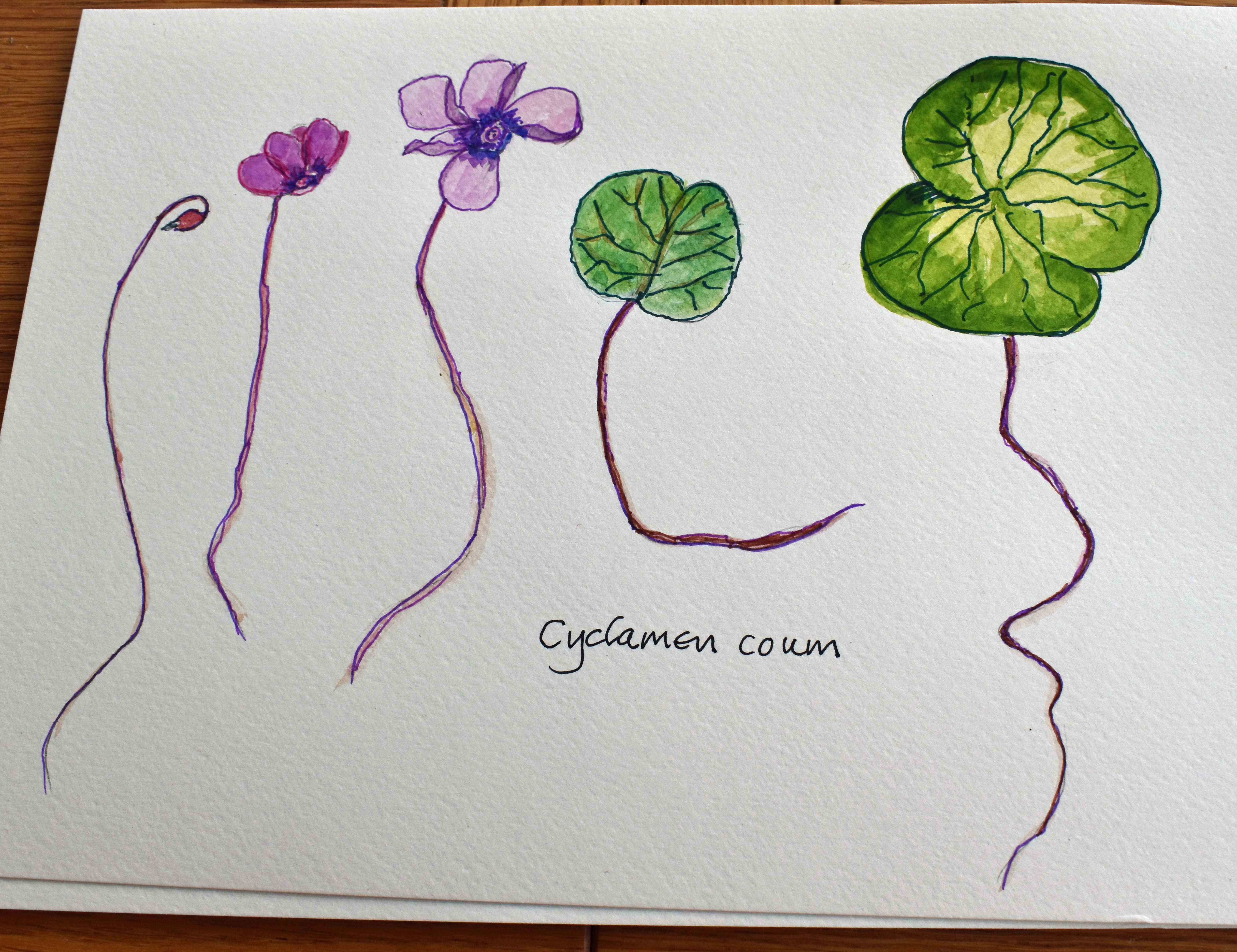 Over the page I painted two Cyclamen growing in our Arabella Garden, which were planted as a clump of five small plants and have now become a lovely ground-hugging patch in shades of pink with a few whites. The foliage is as interesting as the flowers.