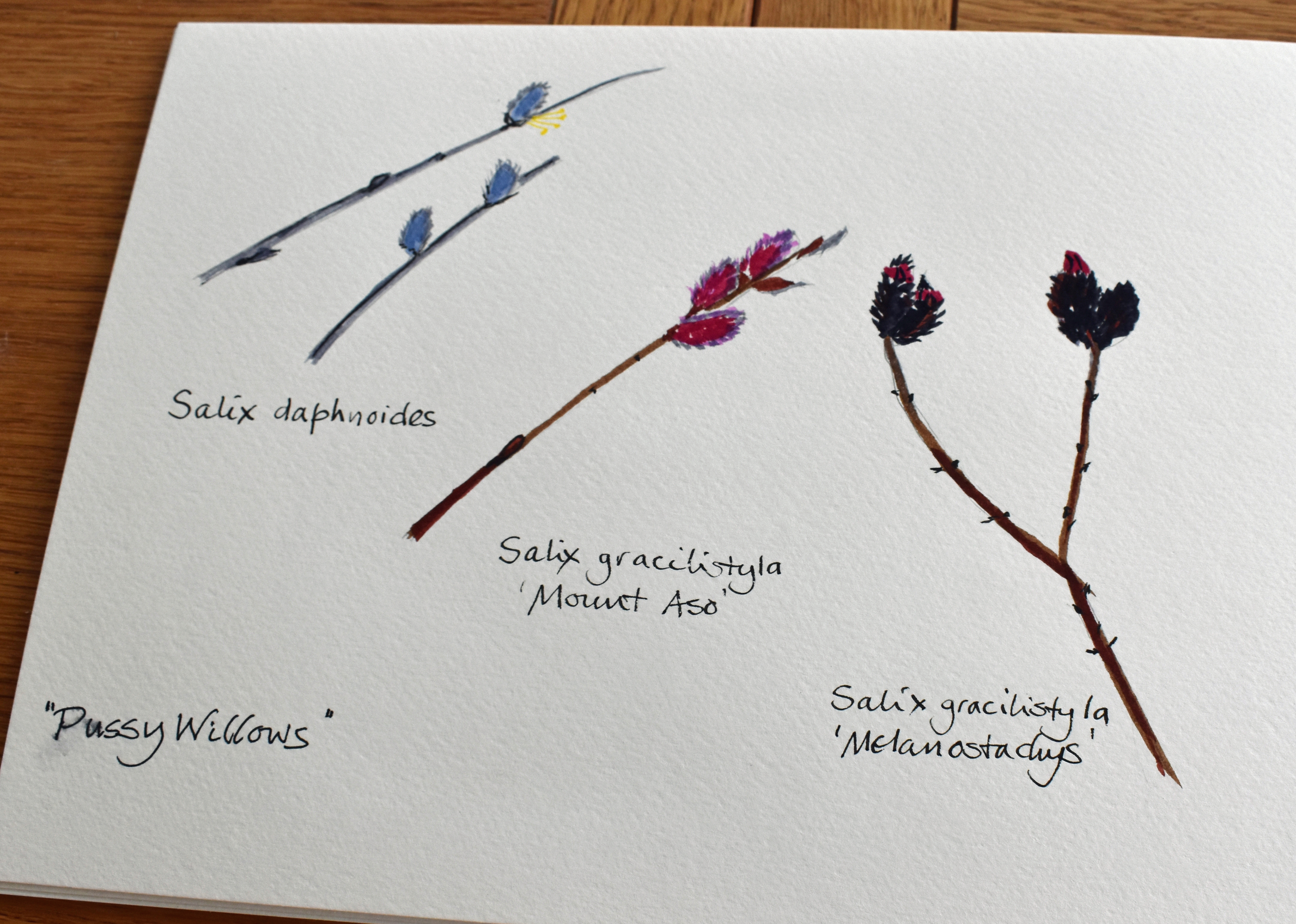 More sketches created using Japanese brush pens appear on the next page where I selected a few branches of some of my favourite Salix shrubs, willows, Salix daphnoides, Salix gracilistyla ‘Mount Aso’ and Salix gracilistyla ‘Melanostachys’. We love these for their unusually coloured catkins.