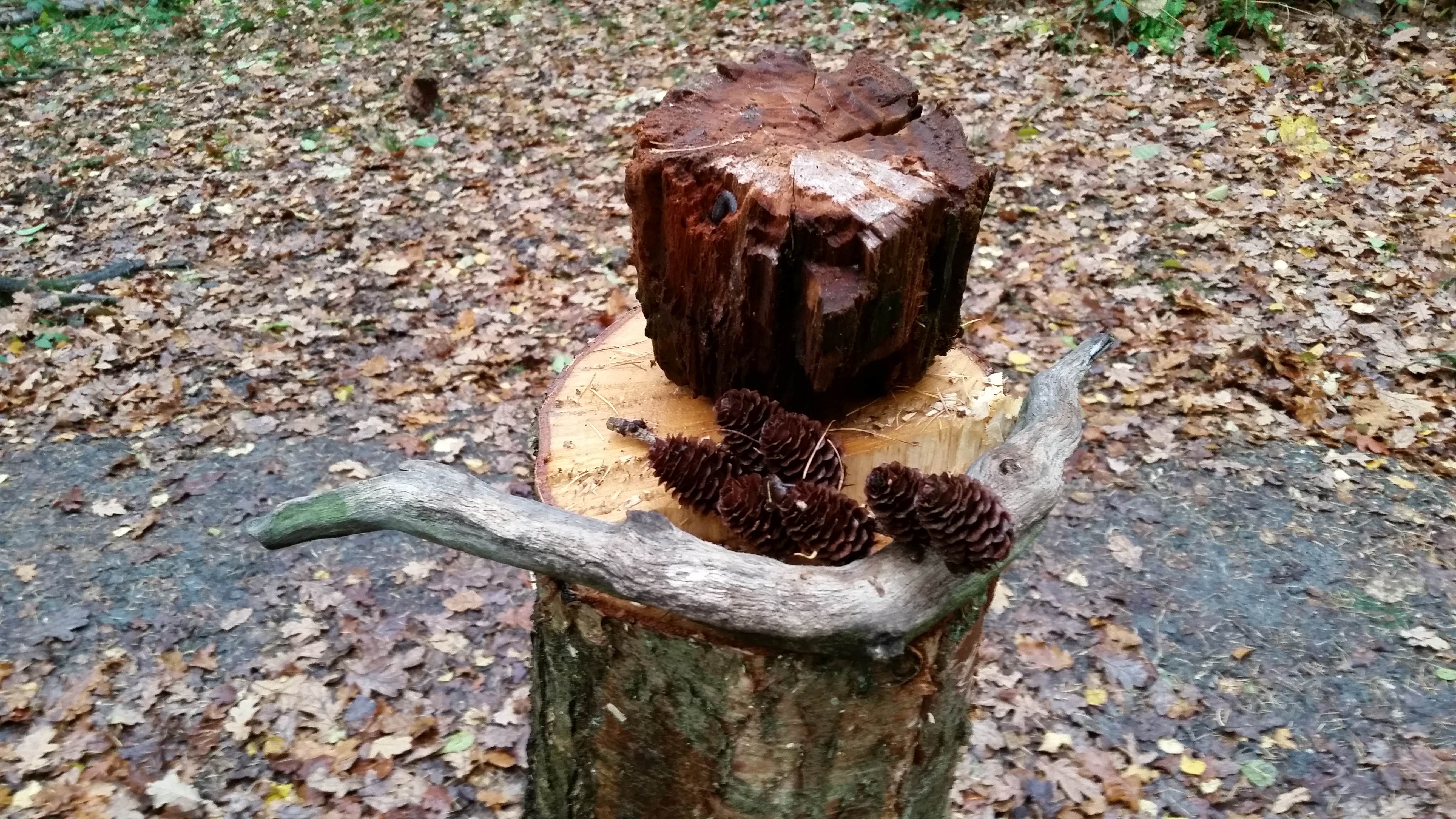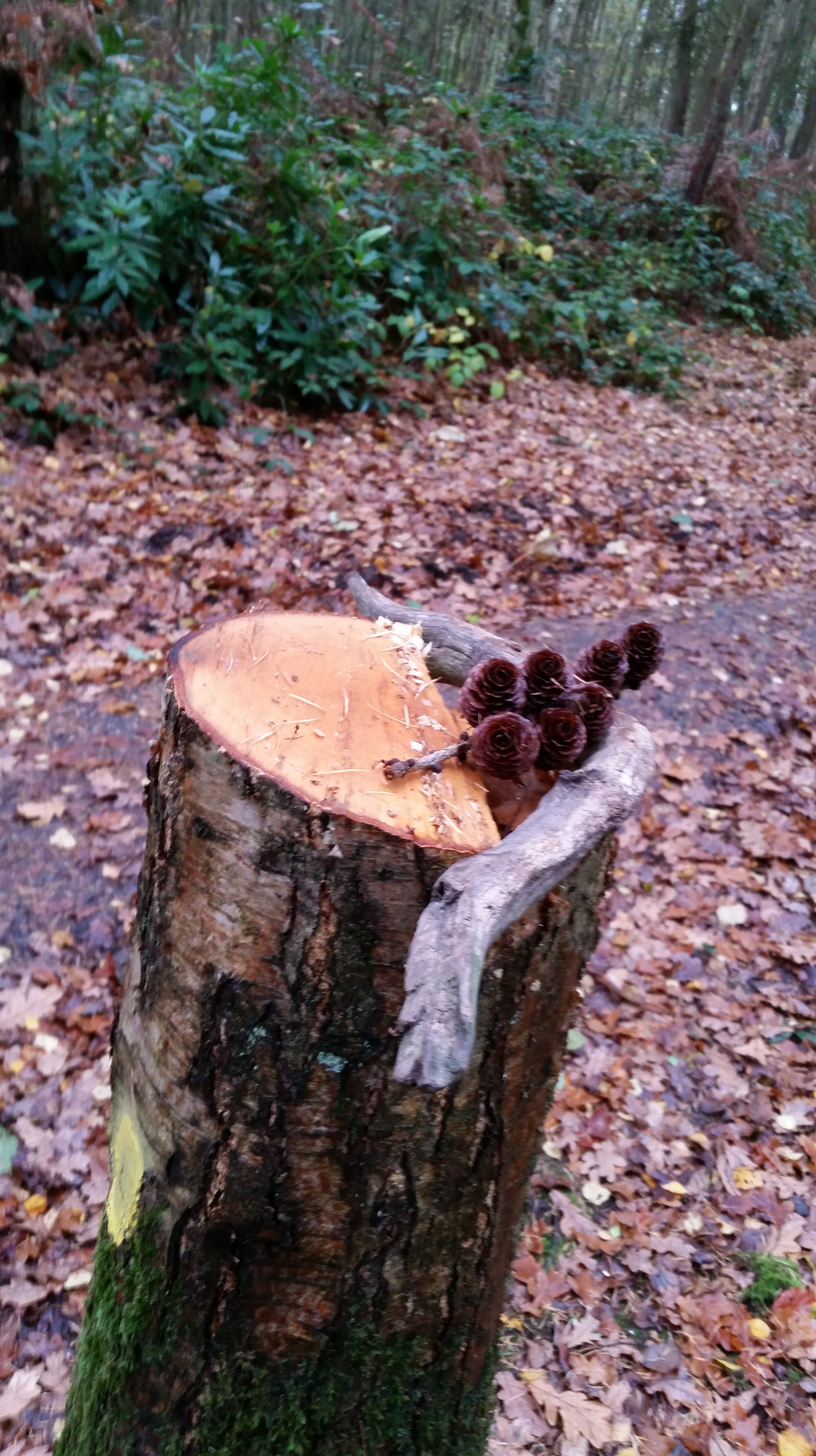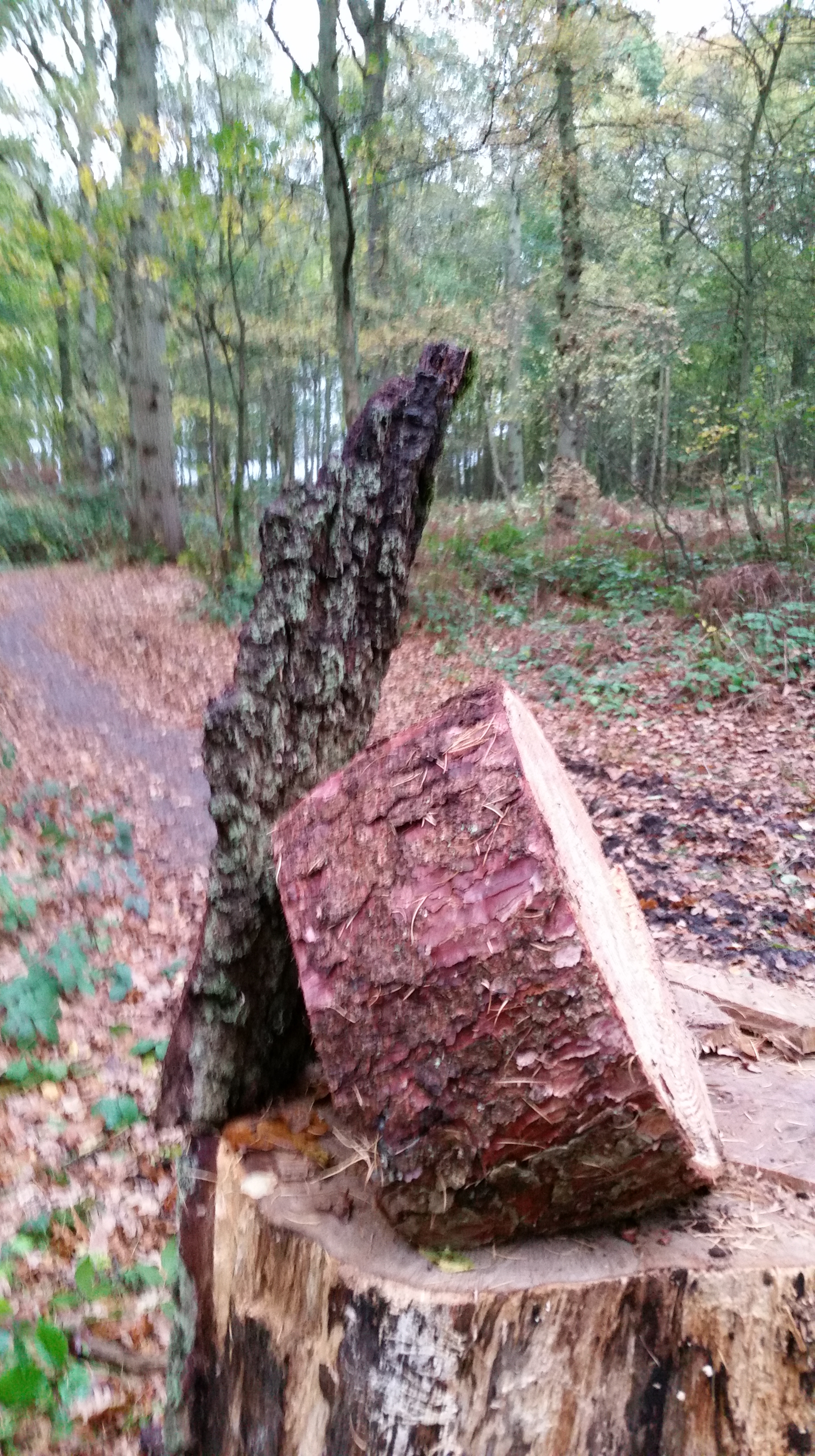 The woodsmen who had been working on autumnal maintenance work left behind them little blocks and wedges of wood. Following on from the piece of found object sculpture we discovered and enjoyed earlier we both started to follow their initiative and got creative. The stumps left behind gave us ready-made plinths to work on.
