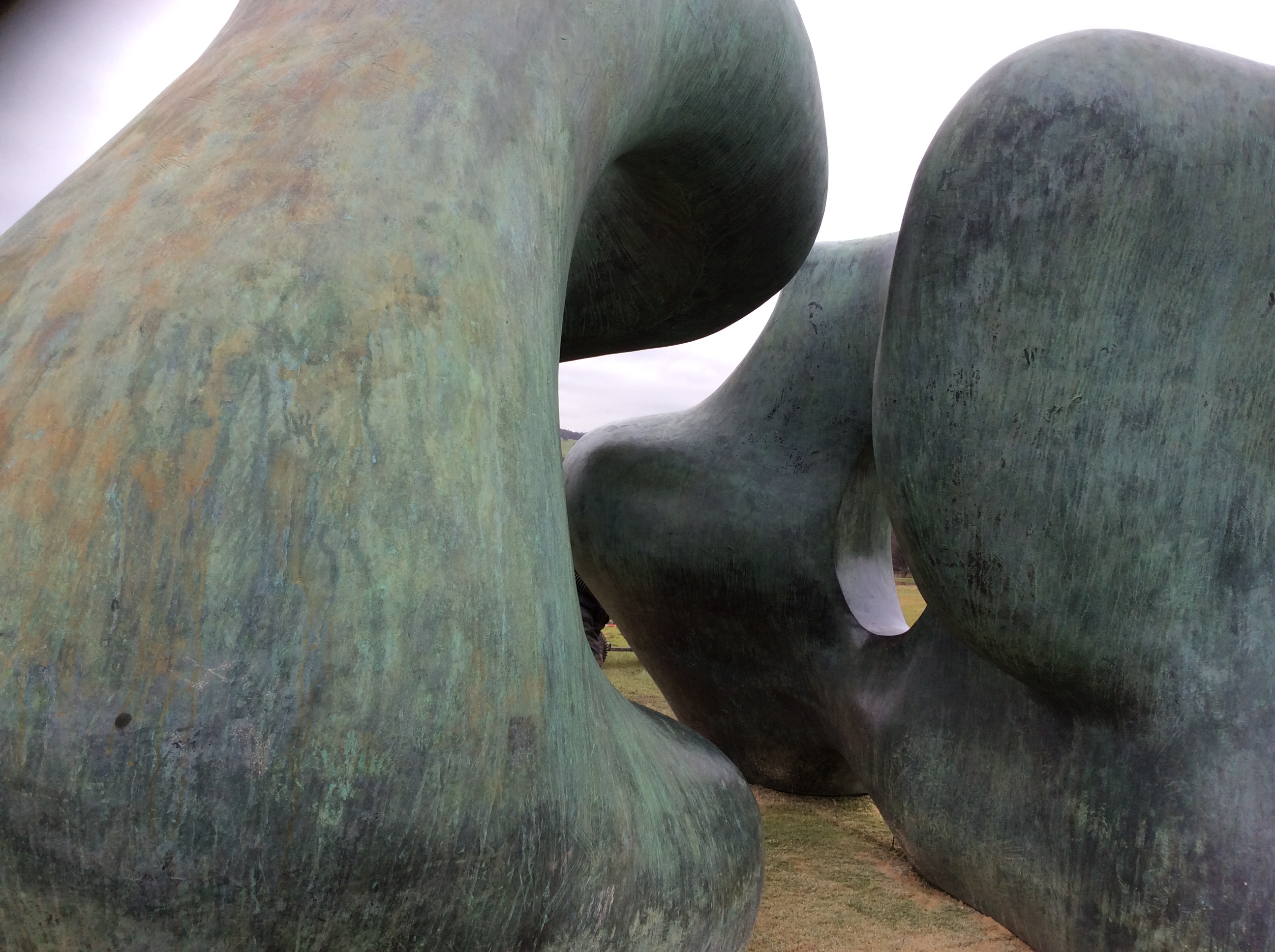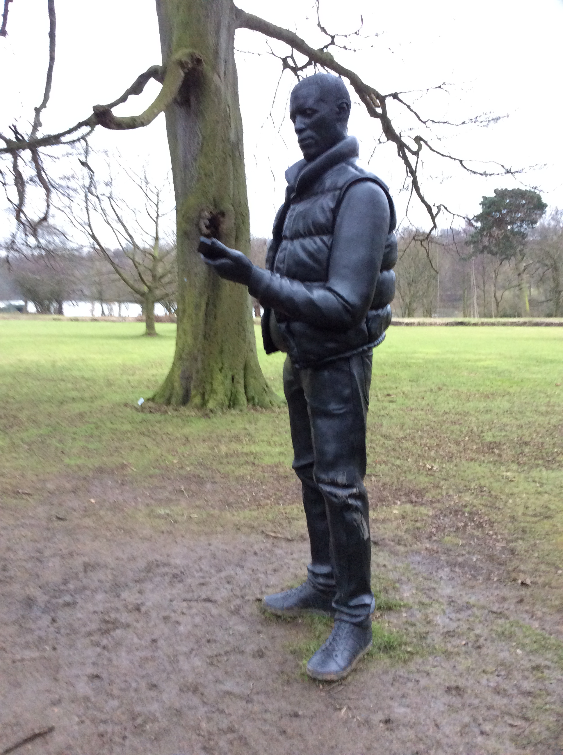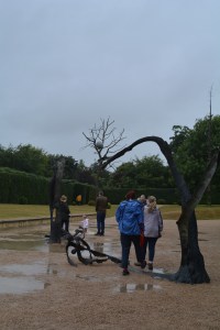 You can see from the photo of Jude below that the weather was not making wandering around the site too easy. The ground beneath our feet was very slippery. This meant that when we came to seek out the work of Henry Moore we found it difficult to get to them as the ground was impossible to walk on due to the steep sloping land where they were situated.