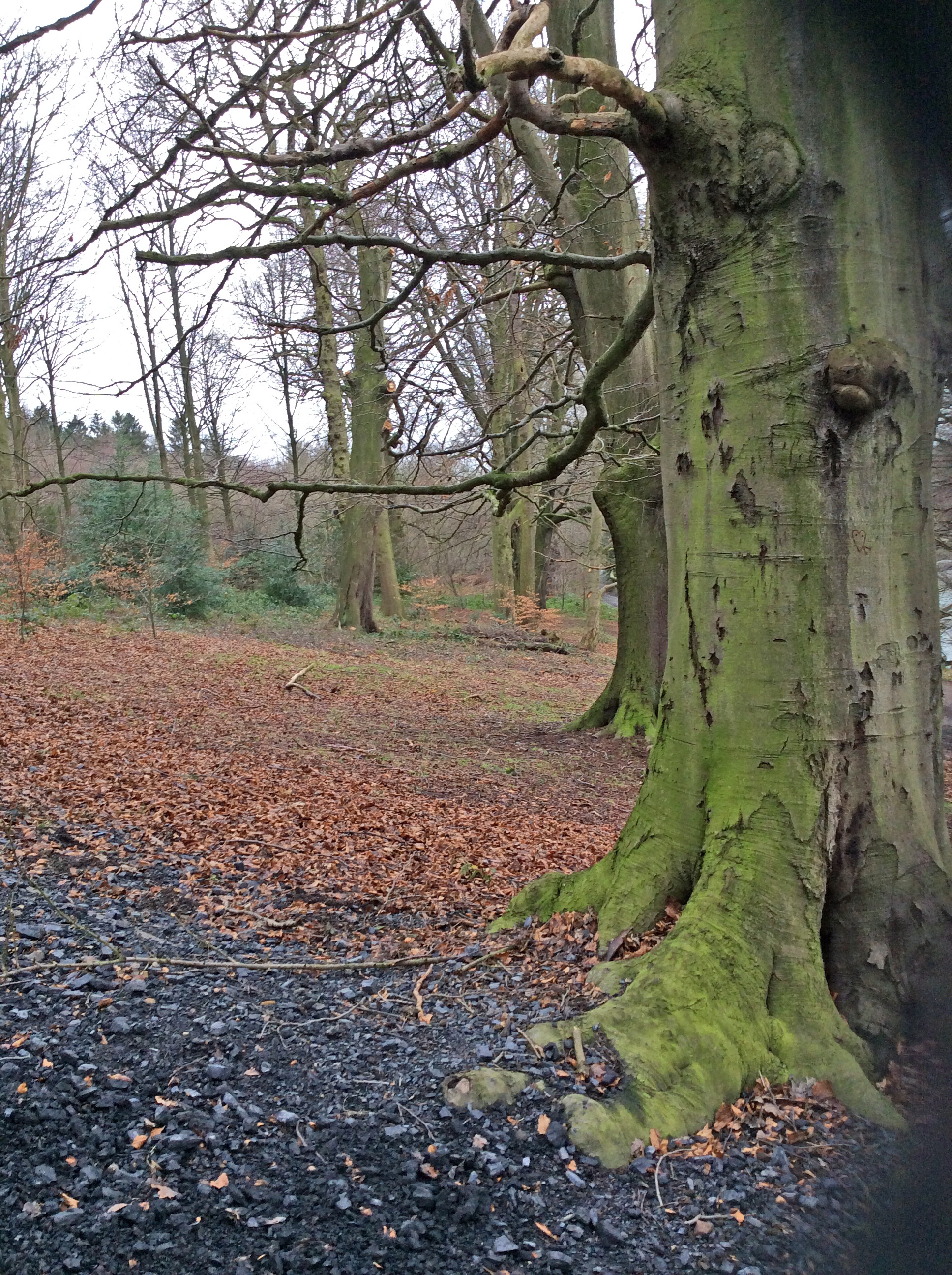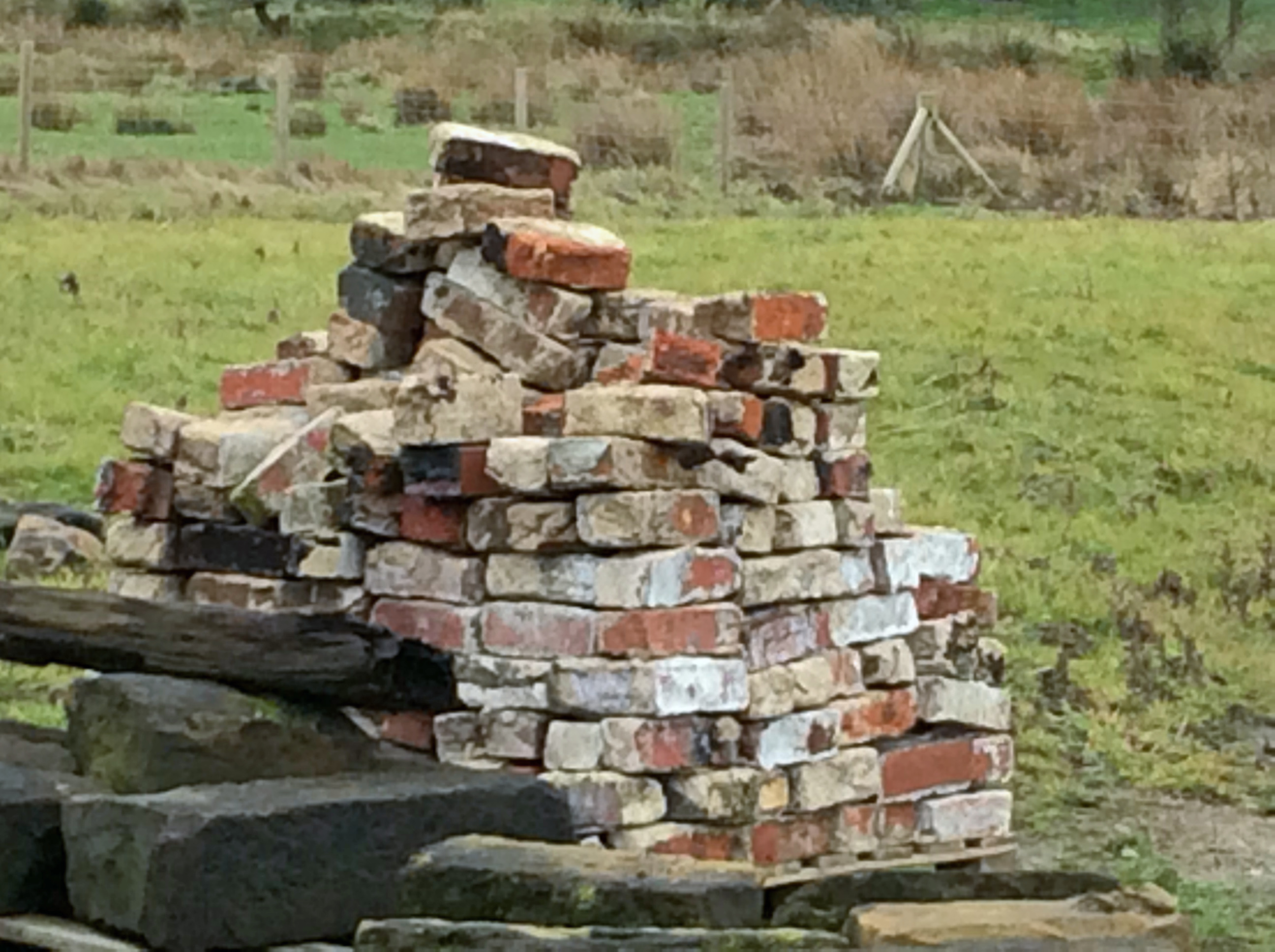 On a piece of rough ground close to the lake we came across a builder’s store where old bricks and building stones were being kept whilst work was being completed on an old chapel in the grounds. We couldn’t help but wonder what a good land artist would have created using these pieces! Close by mother Nature had created a piece of her own land art based on a fallen tree.